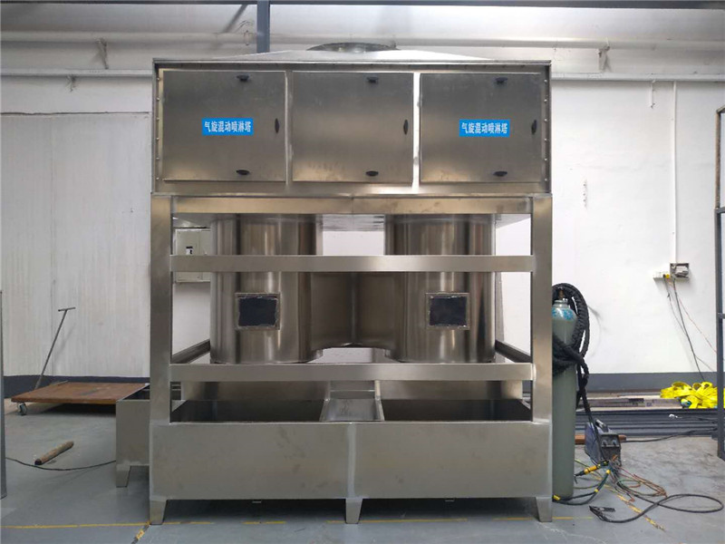氣旋混動噴淋塔設備的工作原理: 當生產作業(yè)時,煙塵廢氣在風機牽引力的作用下進入高速混流導軌裝置,煙塵廢氣在離心力的作用下進液乳化反應,在混流液的高速旋轉狀態(tài)下,煙塵廢氣與旋轉液體充分混合吸收相溶增加煙塵比重,利用旋流裝置設計好的離心力達到氣液分離,分離后的氣體進入環(huán)保填料吸附層,螺旋噴頭噴出的對應溶劑均勻分布在填料上,由于填料的合理設計,煙塵廢氣浸透在填料的時間較長,廢氣與反應液在環(huán)保填料表面有充分的氣液相溶反應時間,從而達到達標排放的目的。