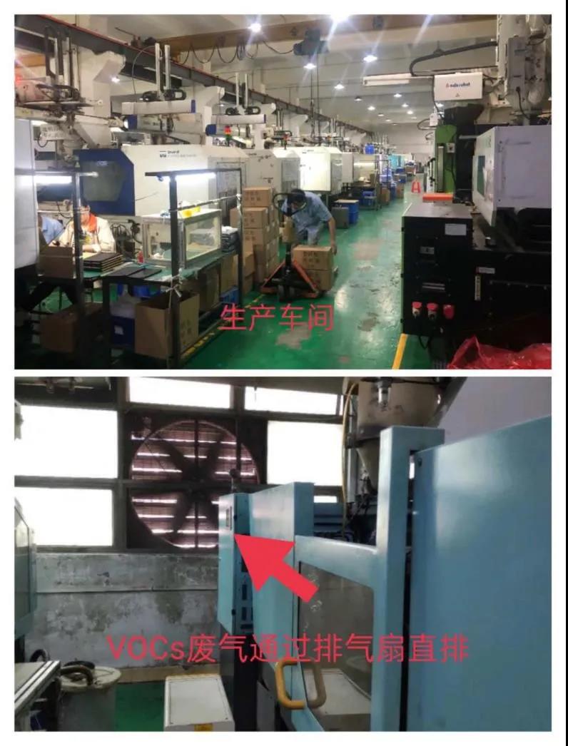 現(xiàn)場檢查時,該單位正在生產,注塑機正在使用,但未配套廢氣防治處理設施,注塑機產生的非甲烷總烴廢氣未經(jīng)處理無組織排放。部分有機廢氣通過排氣扇直接排放,涉嫌逃避監(jiān)管行為。