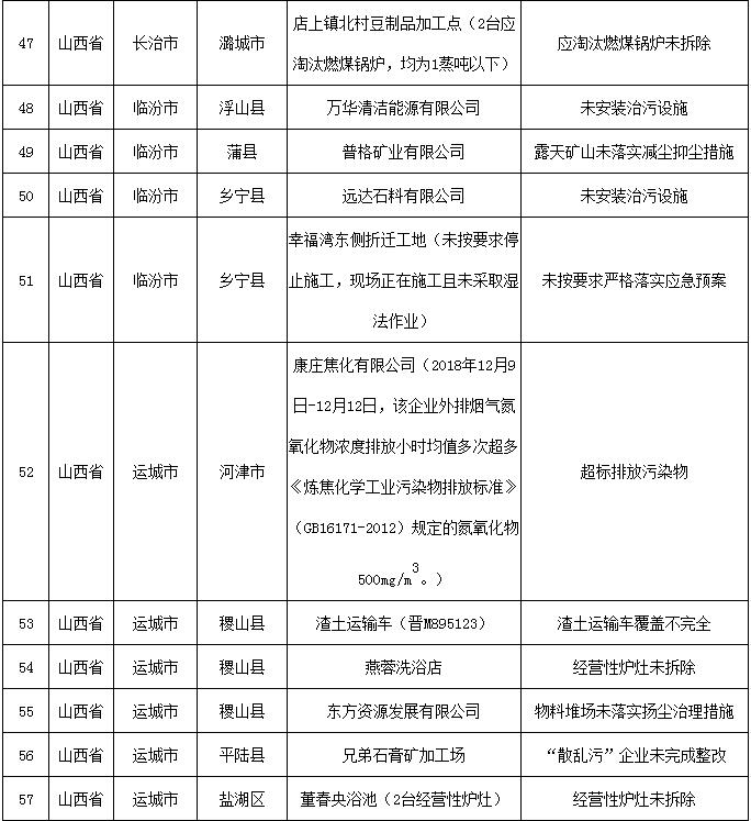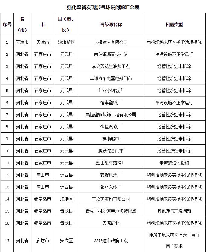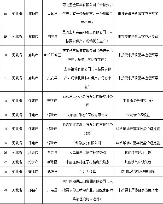2018-2019年藍(lán)天保衛(wèi)戰(zhàn)重點(diǎn)區(qū)域強(qiáng)化監(jiān)督工作繼續(xù)開展,12月13日工作組發(fā)現(xiàn)涉氣環(huán)境問題80個(gè)(其中1家企業(yè)有2臺(tái)應(yīng)淘汰燃煤鍋爐,1家企業(yè)有2臺(tái)經(jīng)營(yíng)性爐灶),12月14日工作組發(fā)現(xiàn)未嚴(yán)格執(zhí)行重污染天氣應(yīng)急響應(yīng)問題23個(gè)(見附表)。