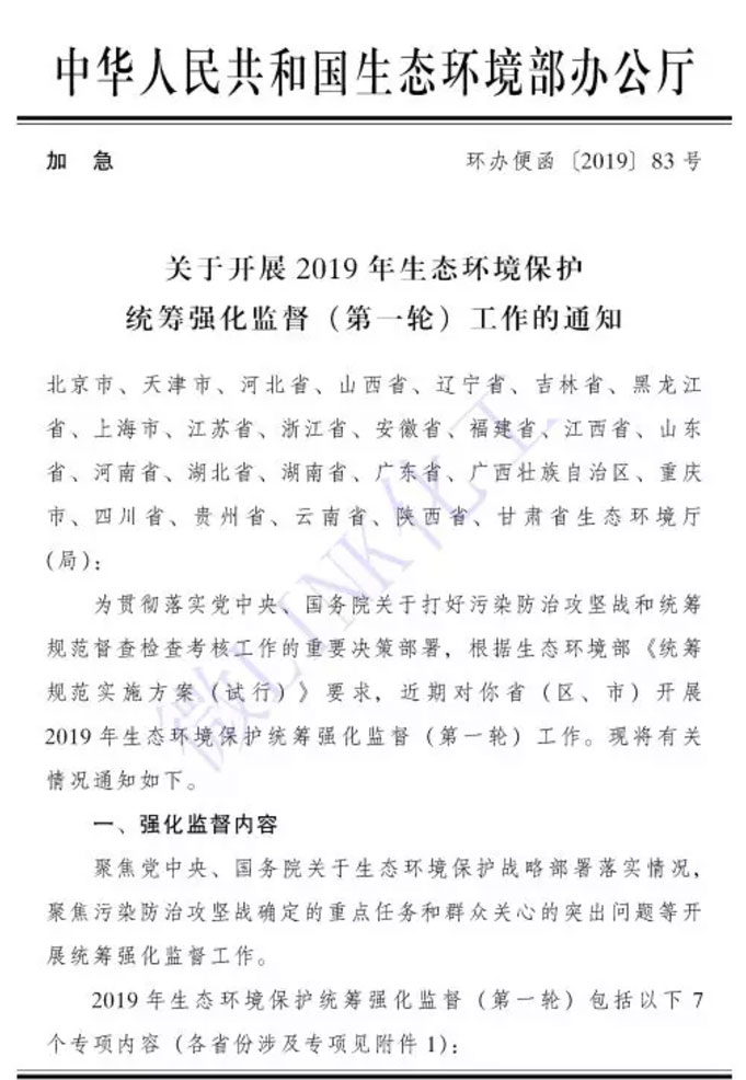 近期,生態(tài)環(huán)境部根據(jù)《統(tǒng)籌規(guī)范實施方案(試行)》要求,將對25個省市、自治區(qū)開展2019年生態(tài)環(huán)境保護統(tǒng)籌強化監(jiān)督。主要是對黨中央、國務(wù)院關(guān)于生態(tài)環(huán)境保護戰(zhàn)略部署落實情況、污染防治攻堅戰(zhàn)確定的重點任務(wù)和群眾關(guān)心的突出問題等工作進行監(jiān)督檢查,涉及城市黑臭水體治理、飲用水水源地保護、“清廢行動”、打擊“洋垃圾”進口、斯德哥爾摩公約和汞公約履約、信訪線索等專項檢查行動。此次統(tǒng)籌強化監(jiān)督抽調(diào)水體環(huán)境部相關(guān)司局和直屬單位、地方生態(tài)環(huán)境部門、住建部門等相關(guān)人員組成生態(tài)環(huán)保工作組,工作組獨立開展工作,實行工作組組長負責制,成立若個現(xiàn)場組,承擔相關(guān)地方現(xiàn)場監(jiān)督檢查工作。