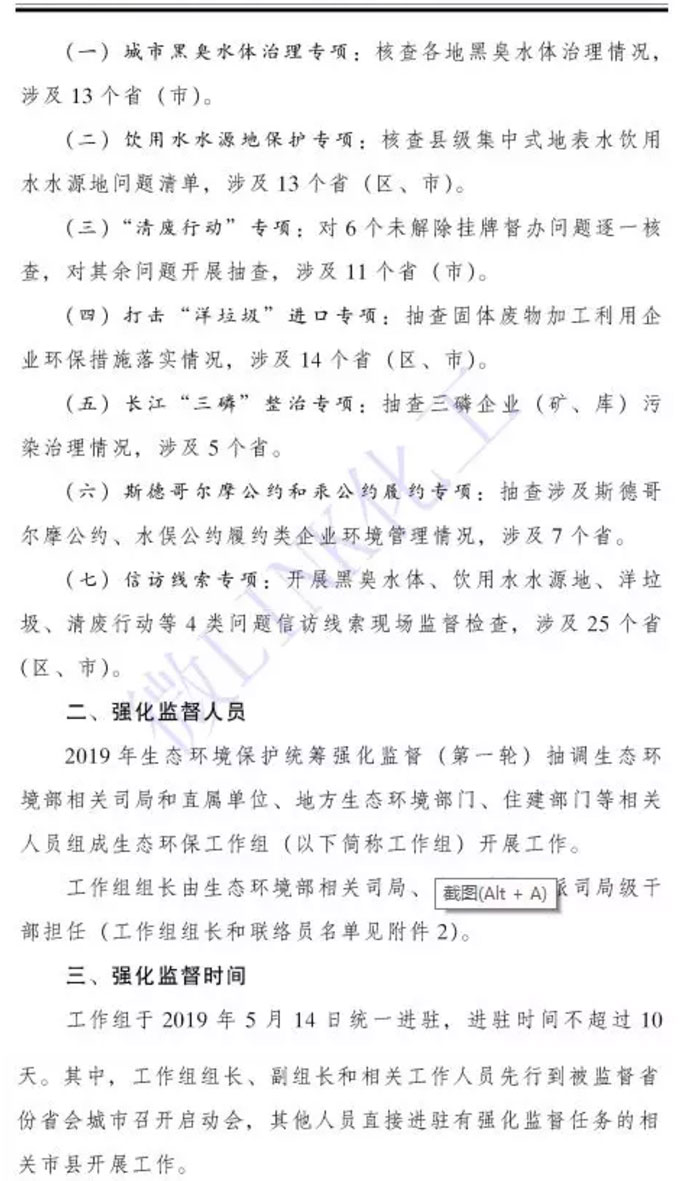 (四)打擊“洋垃圾”進口專項:抽查固體廢物加工利用企業(yè)保護措施落實情況,涉及14個?。▍^(qū)、市)。(五)長江“三磷”整治專項:抽查三磷企業(yè)(礦、庫)污染治理情況,涉及5個省。